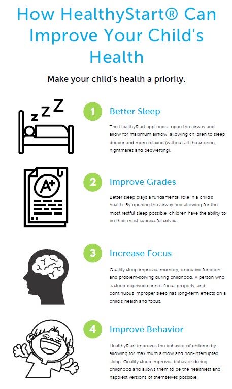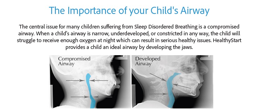 Sleep Disordered Breathing (SDB) is an all-inclusive term for breathing difficulties, ranging from mild snoring all the way to severe airway obstruction during sleep. When your child’s breathing is disrupted, his or her body recognizes the disruption much like choking, therefore, slowing the heart rate, raising the blood pressure, arousing the brain, ultimately disrupting sleep. Traditionally, there have been very few answers to treating this issue, but Babcock Dentistry is now using Healthy Start to treat these issues.